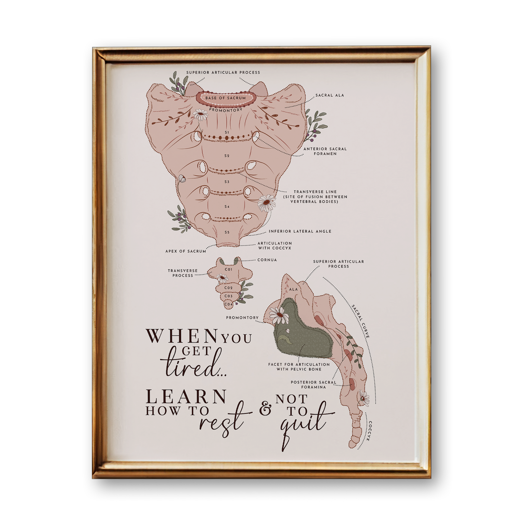 Transform your medical practice with this stunning Sacrum & Coccyx Spine Anatomy Art Print! Not only will it add a touch of motivation to your space, but it also serves as a beautiful educational tool. With a unique design and a powerful motivational quote, this art print is a perfect addition to any medical setting. Order yours today and be inspired!